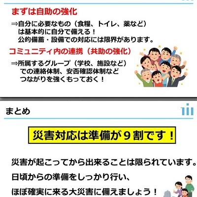 中でも1番のポイントとして大事なのは『準備』が9割ということで、『自助』『共助』『公助』ということで、心の準備、必要な物品の準備、非常時の対応・訓練等の準備、地域との連携の準備、災害情報取得の準備、いろいろな準備が必要で、いざというときに行動できるように前もって準備しておかないといけないと職員一同改めて実感しました。