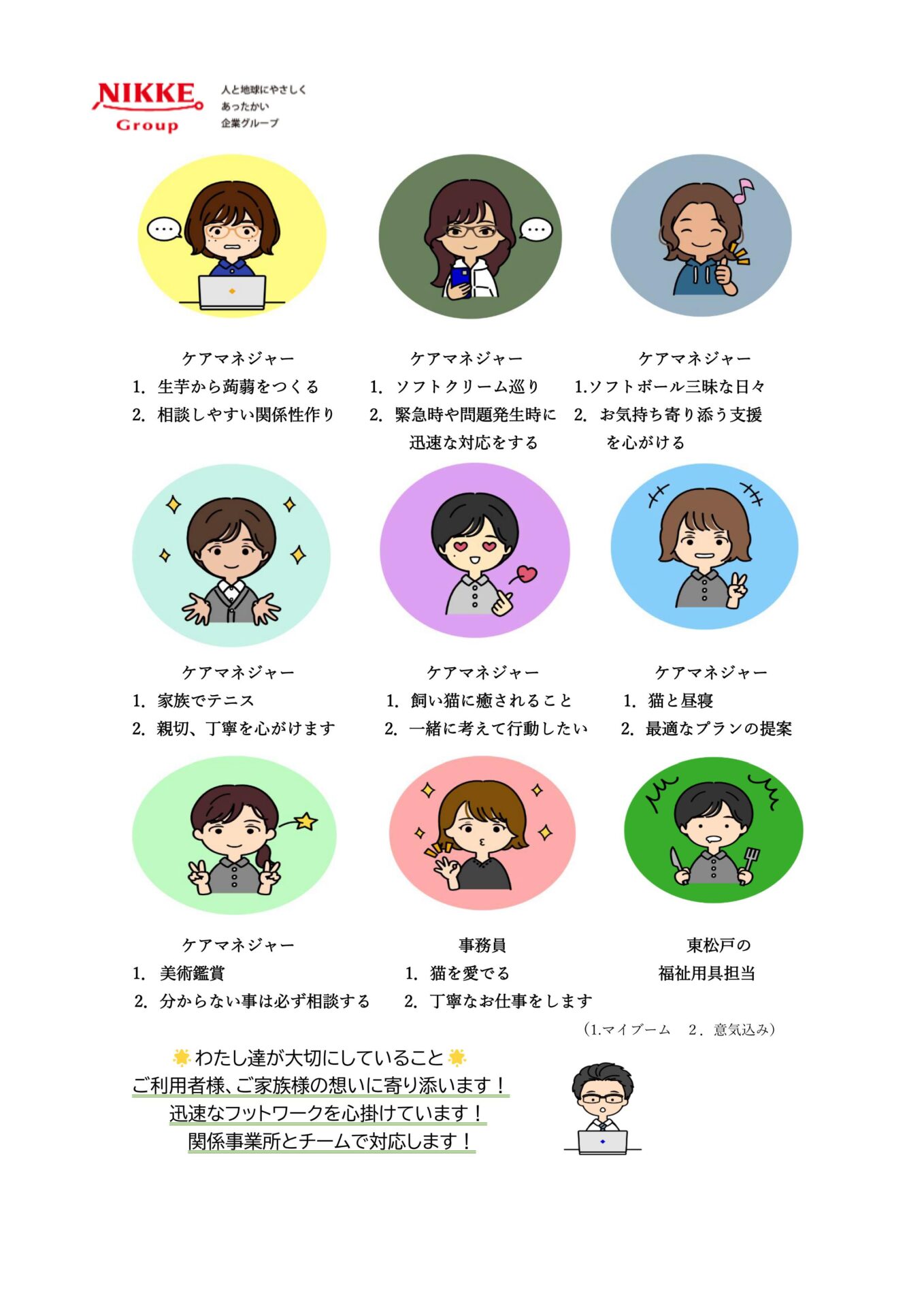 ケアマネジャー 2025.11.01 ☆介護のパムコ東松戸 新リーフレット完成☆ この度、当居宅介護支援事業所のリーフレットをリニューアルいたしました。 事業所の雰囲気も感じていただけるよう、所属しているケアマネジャーも可愛らしいイラストでご紹介しておりますので、ぜひご覧ください。