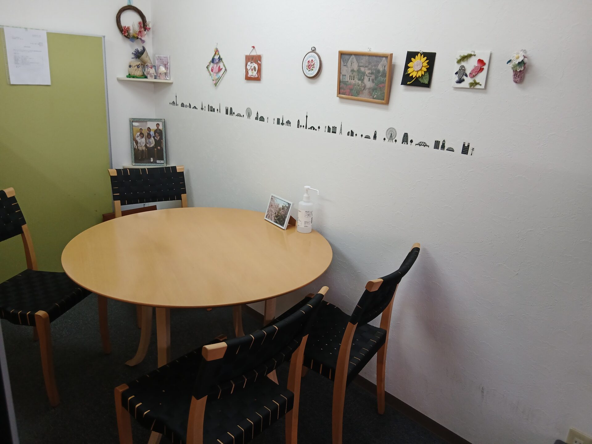白い壁には利用者様やご家族様が心を込めて作ってくださった素敵な作品や写真が飾られていて、